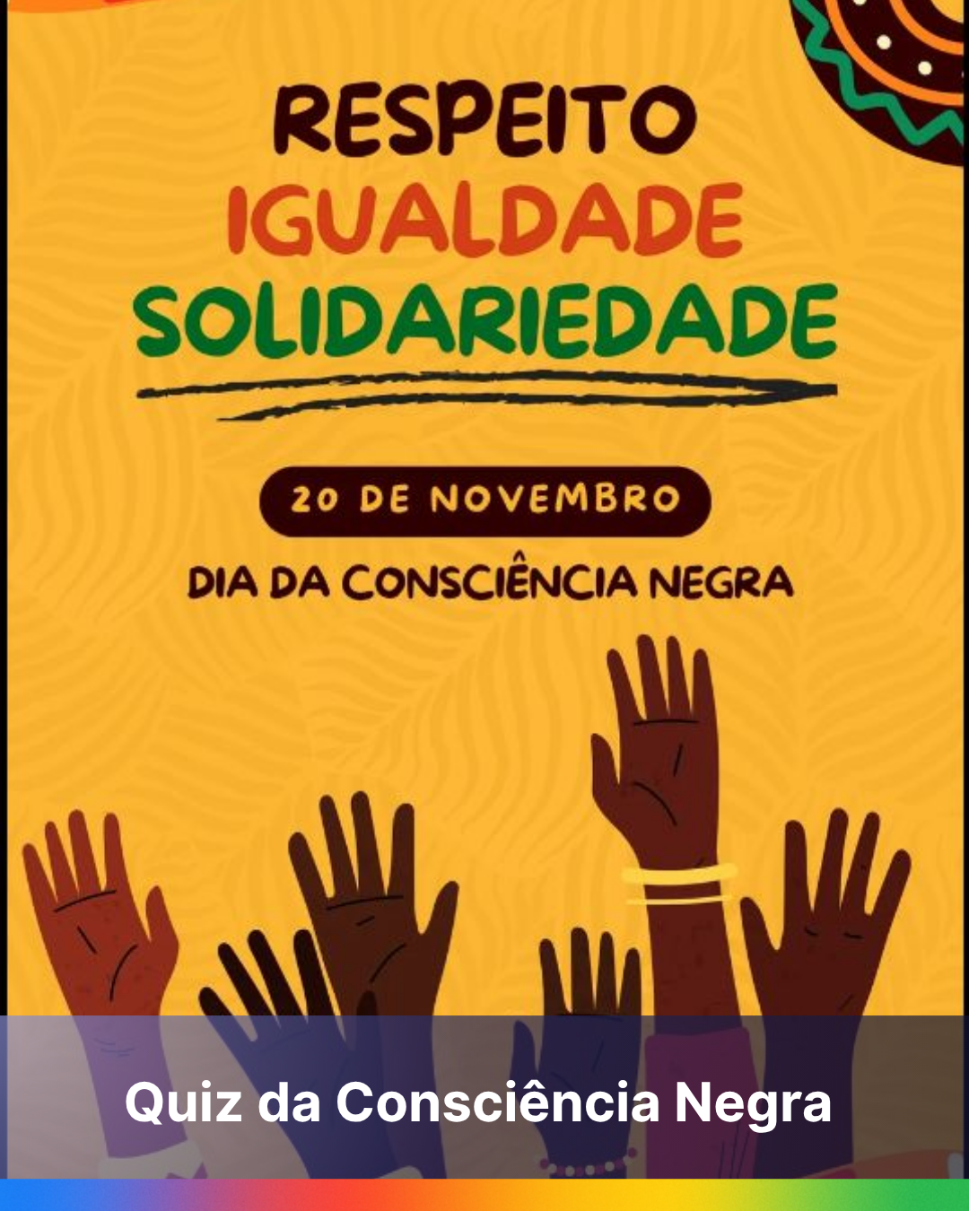 Este quiz foi criado para ajudar os alunos a refletirem sobre a importância do Dia da Consciência Negra, comemorado em 20 de novembro. De forma lúdica e educativa, as perguntas abordam quem foi Zumbi dos Palmares, o significado dos quilombos, a luta contra a escravidão e a valorização da cultura afro-brasileira.